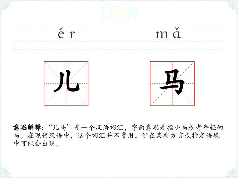 “儿马”是一个汉语词汇,字面意思是指小马或者年轻的马。在现代汉语中,这个词汇并不常用,但在某些方言或特定语境中可能会出现。