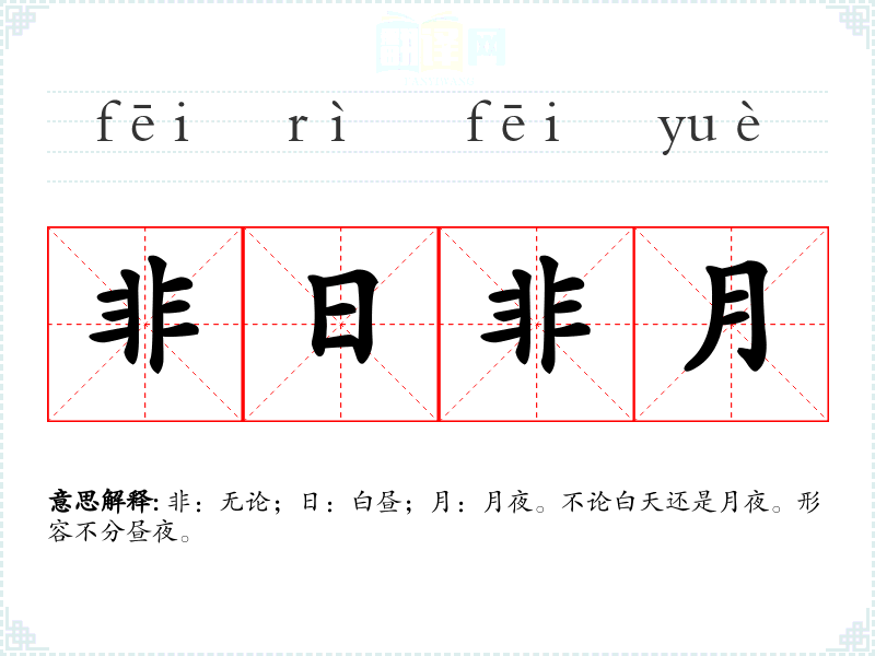 非:无论;日:白昼;月:月夜。不论白天还是月夜。形容不分昼夜。
