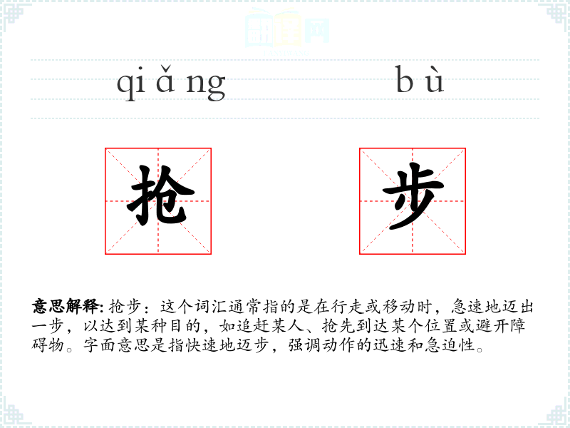抢步:这个词汇通常指的是在行走或移动时,急速地迈出一步,以达到某种目的,如追赶某人、抢先到达某个位置或避开障碍物。字面意思是指快速地迈步,强调动作的迅速和急迫性。