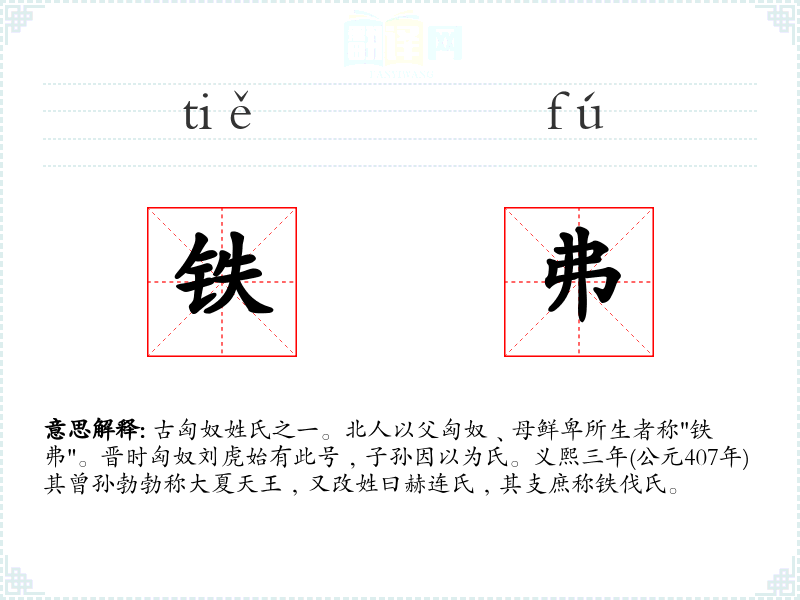 古匈奴姓氏之一。北人以父匈奴﹑母鲜卑所生者称"铁弗"。晋时匈奴刘虎始有此号﹐子孙因以为氏。义熙三年(公元407年)其曾孙勃勃称大夏天王﹐又改姓曰赫连氏﹐其支庶称铁伐氏。