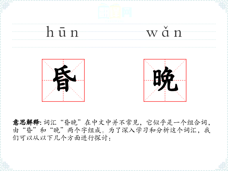 词汇“昏晚”在中文中并不常见,它似乎是一个组合词,由“昏”和“晚”两个字组成。为了深入学*和分析这个词汇,我们可以从以下几个方面进行探讨: