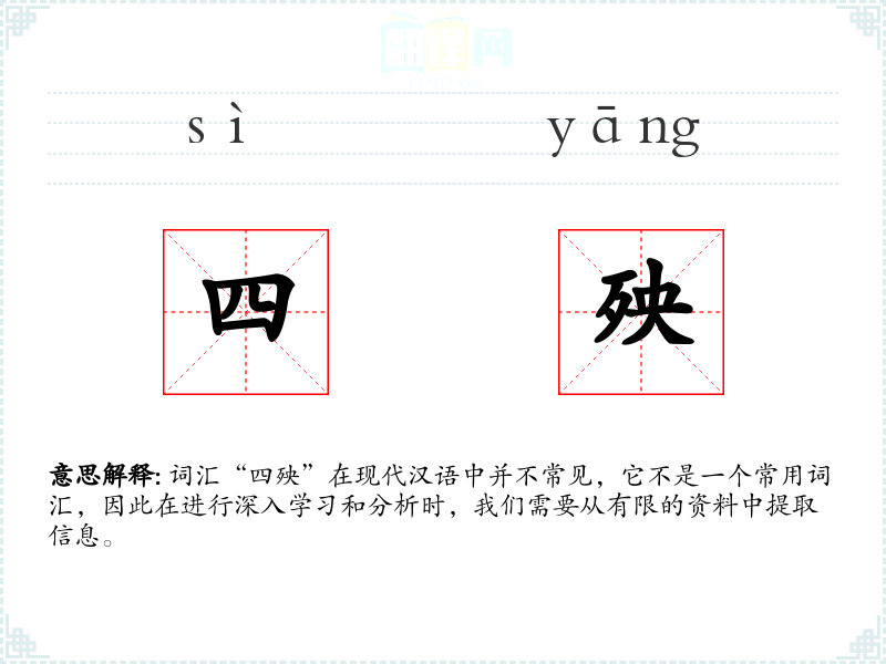 词汇“四殃”在现代汉语中并不常见,它不是一个常用词汇,因此在进行深入学*和分析时,我们需要从有限的资料中提取信息。