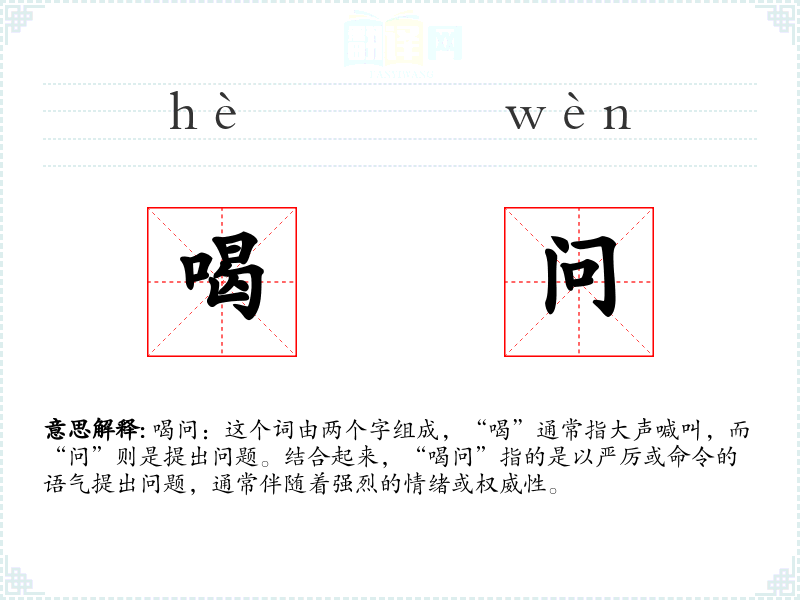 喝问:这个词由两个字组成,“喝”通常指大声喊叫,而“问”则是提出问题。结合起来,“喝问”指的是以严厉或命令的语气提出问题,通常伴随着强烈的情绪或权威性。
