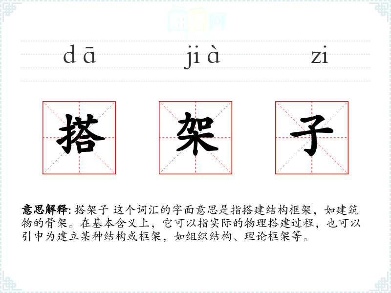 搭架子 这个词汇的字面意思是指搭建结构框架,如建筑物的骨架。在基本含义上,它可以指实际的物理搭建过程,也可以引申为建立某种结构或框架,如组织结构、理论框架等。