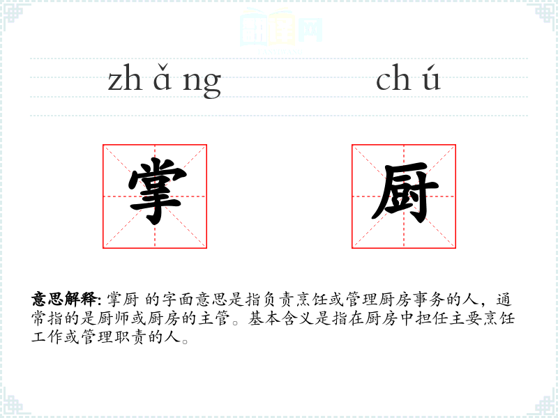 “掌厨”一词由“掌”和“厨”两个字组成。“掌”字原意为手掌,引申为掌握、管理;“厨”字指厨房。两者结合,形成了指代管理厨房和烹饪的人的词汇。