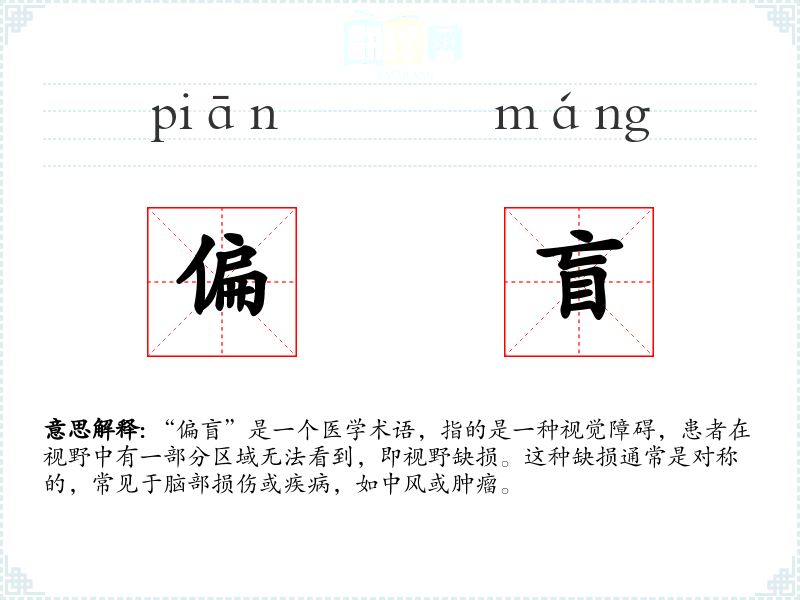 - 医学领域:在医学领域,“偏盲”用于描述患者的视觉功能障碍,特别是在神经眼科学中。