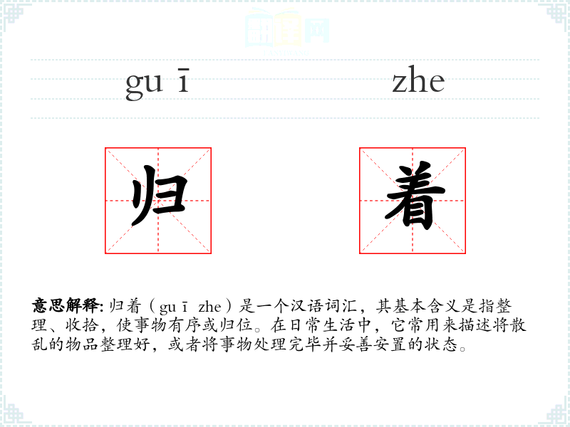 归着(guī zhe)是一个汉语词汇,其基本含义是指整理、收拾,使事物有序或归位。在日常生活中,它常用来描述将散乱的物品整理好,或者将事物处理完毕并妥善安置的状态。