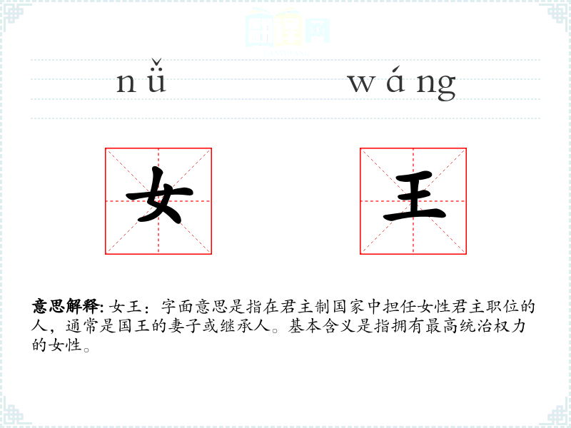女王:字面意思是指在君主制国家中担任女性君主职位的人,通常是国王的妻子或继承人。基本含义是指拥有最高统治权力的女性。