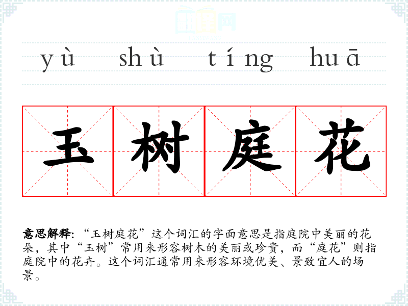 “玉树庭花”这个词汇的字面意思是指庭院中美丽的花朵,其中“玉树”常用来形容树木的美丽或珍贵,而“庭花”则指庭院中的花卉。这个词汇通常用来形容环境优美、景致宜人的场景。