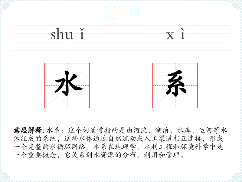 - 反义词:旱地、沙漠(这些词汇与水系形成对比,指的是缺乏水资源的地理区域)