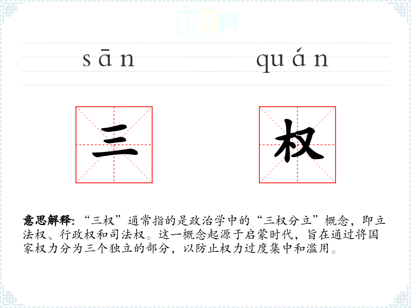 “三权”通常指的是政治学中的“三权分立”概念,即立法权、行政权和司法权。这一概念起源于启蒙时代,旨在通过将国家权力分为三个独立的部分,以防止权力过度集中和滥用。