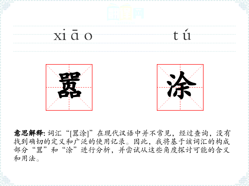 尽管“嚣涂”不是一个常用词汇,但通过对构成部分“嚣”和“涂”的分析,我们可以推测其可能的含义和用法。在语言学*和表达中,了解和掌握这样的词汇可以帮助我们更准确地描述和理解复杂的场景和状态。
