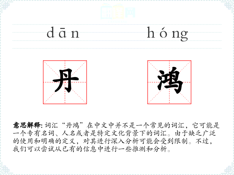 “丹鸿”的字面意思可以分解为“丹”和“鸿”两个字。