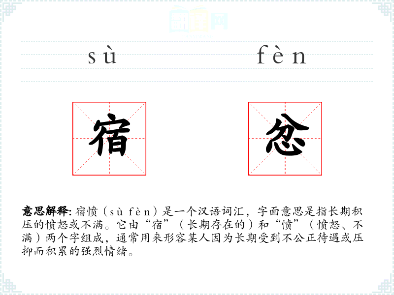 宿愤(sù fèn)是一个汉语词汇,字面意思是指长期积压的愤怒或不满。它由“宿”(长期存在的)和“愤”(愤怒、不满)两个字组成,通常用来形容某人因为长期受到不公正待遇或压抑而积累的强烈情绪。