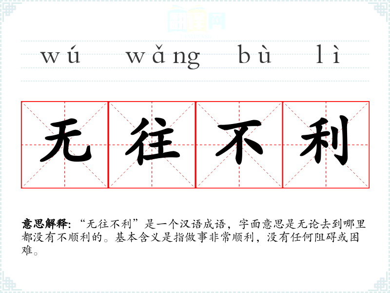 “无往不利”是一个汉语成语,字面意思是无论去到哪里都没有不顺利的。基本含义是指做事非常顺利,没有任何阻碍或困难。