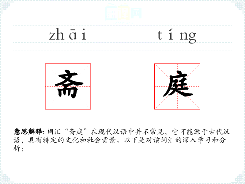 词汇“斋庭”在现代汉语中并不常见,它可能源于古代汉语,具有特定的文化和社会背景。以下是对该词汇的深入学*和分析: