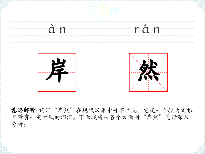 - 文学语境:在古典文学中,如诗词、文言文中,“岸然”常用来形容人物的仪态或气质,如“岸然道貌”形容一个人外表庄重、严肃。
