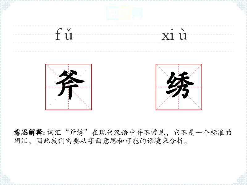 词汇“斧绣”在现代汉语中并不常见,它不是一个标准的词汇,因此我们需要从字面意思和可能的语境来分析。