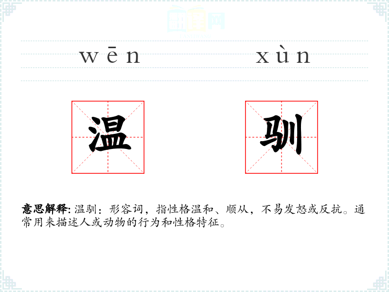 温驯:形容词,指性格温和、顺从,不易发怒或反抗。通常用来描述人或动物的行为和性格特征。