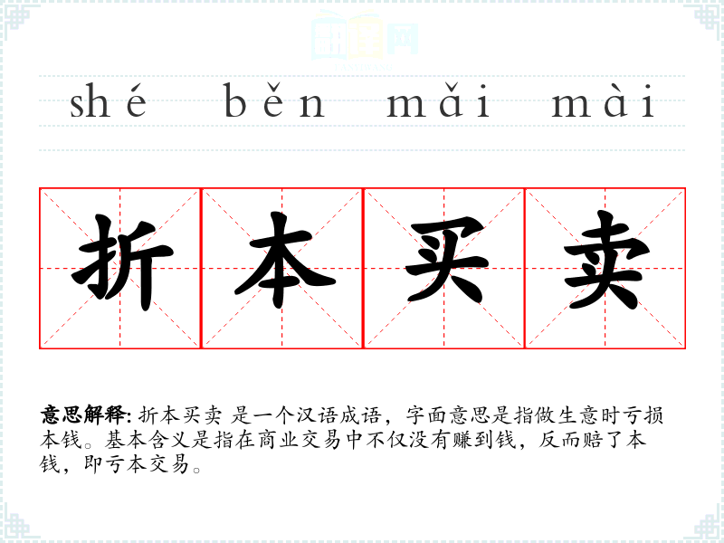 折本买卖 是一个汉语成语,字面意思是指做生意时亏损本钱。基本含义是指在商业交易中不仅没有赚到钱,反而赔了本钱,即亏本交易。