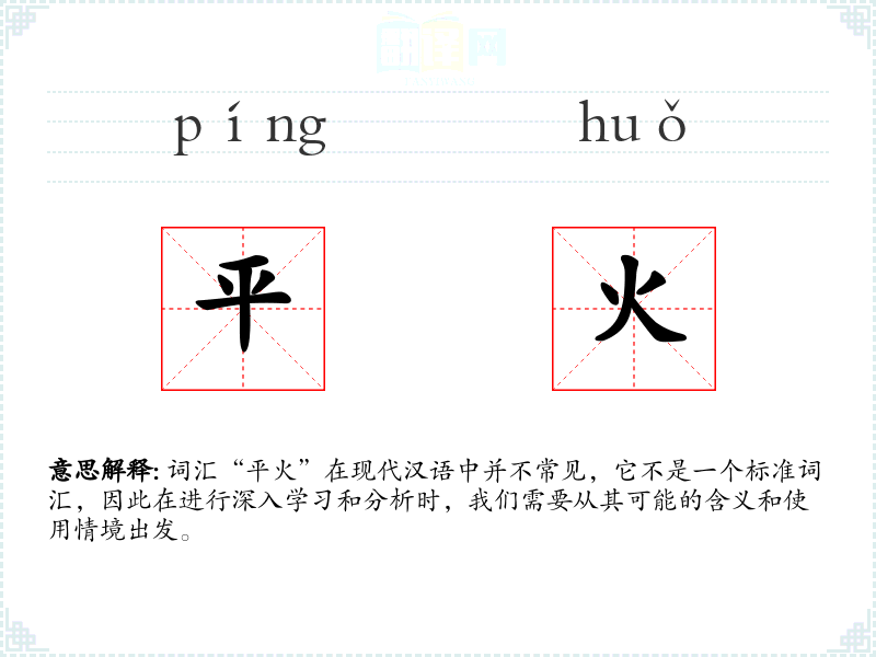 词汇“平火”在现代汉语中并不常见,它不是一个标准词汇,因此在进行深入学习和分析时,我们需要从其可能的含义和使用情境出发。