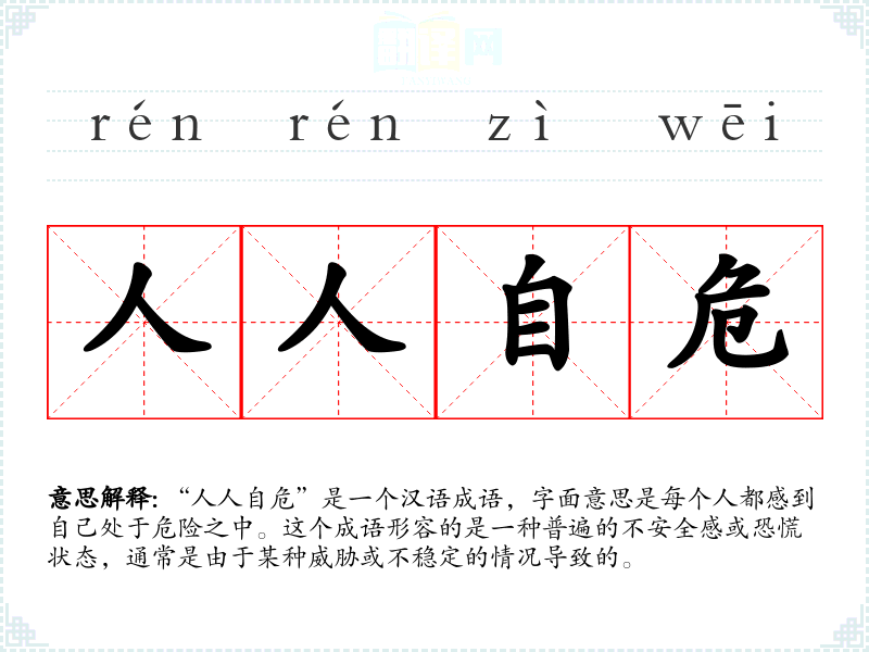 “人人自危”是一个汉语成语,字面意思是每个人都感到自己处于危险之中。这个成语形容的是一种普遍的不安全感或恐慌状态,通常是由于某种威胁或不稳定的情况导致的。