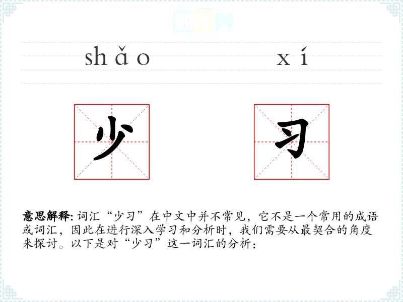 “少”字面意思是指年轻时学或练。其中,“少”指的是年轻,“”指的是学或练。