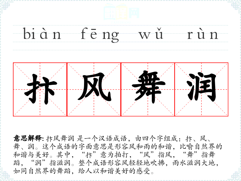 抃风舞润 这个成语的词源较为模糊,可能是由古代文人对自然景色的描绘中逐渐形成的。在古代文学作品中,类似的表达方式较为常见,如“风和日丽”、“风调雨顺”等,都是对自然和谐美的赞美。
