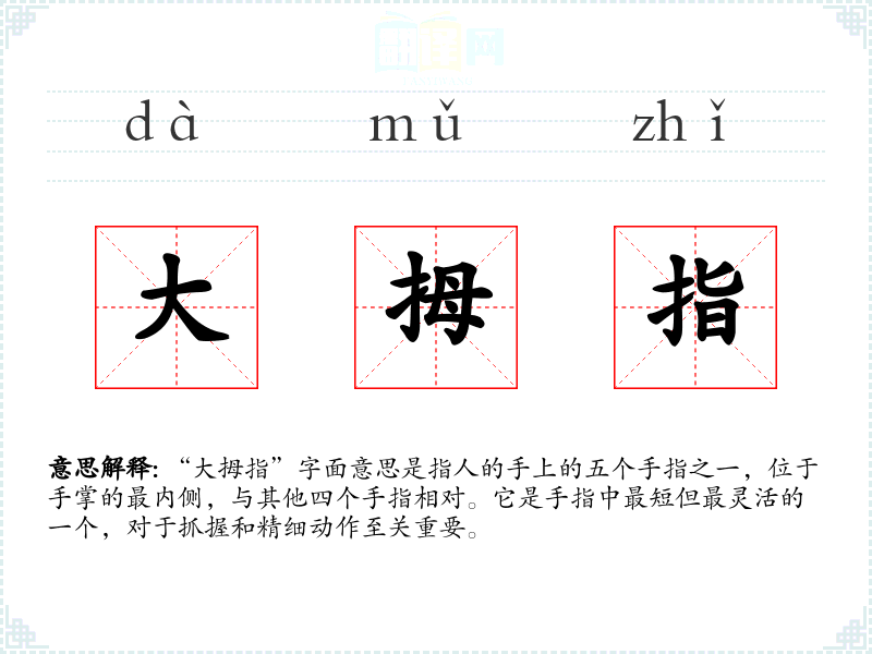 “大拇指”字面意思是指人的手上的五个手指之一,位于手掌的最内侧,与其他四个手指相对。它是手指中最短但最灵活的一个,对于抓握和精细动作至关重要。