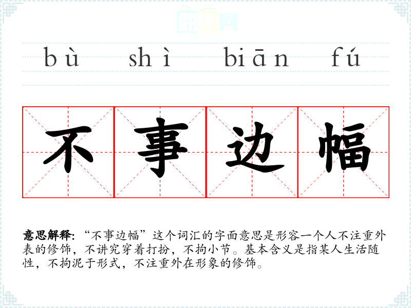“不事边幅”这个词汇的字面意思是形容一个人不注重外表的修饰,不讲究穿着打扮,不拘小节。基本含义是指某人生活随性,不拘泥于形式,不注重外在形象的修饰。