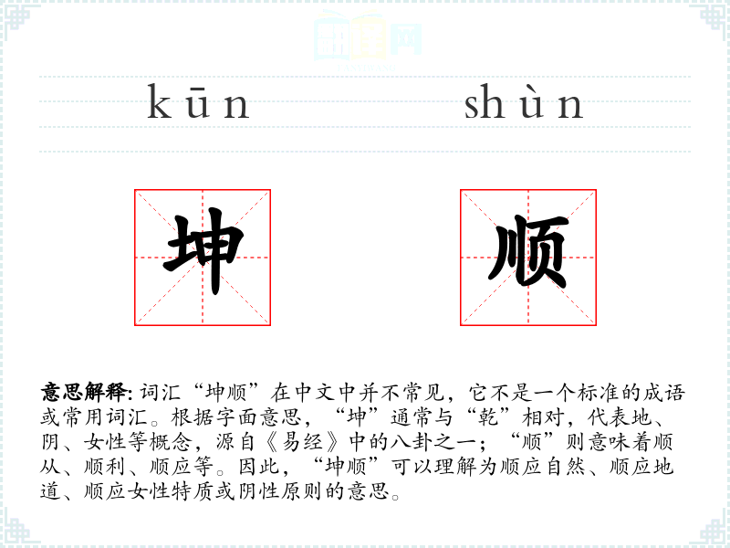 - 理解:“坤顺”是一个富有文化内涵的词汇,强调顺应自然和阴性原则。