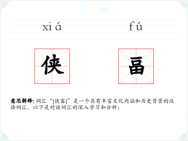 词汇“[侠客]”是一个具有丰富文化内涵和历史背景的汉语词汇。以下是对该词汇的深入学*和分析: