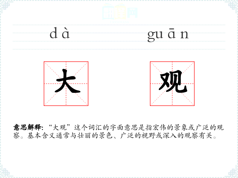 “大观”这个词汇的字面意思是指宏伟的景象或广泛的观察。基本含义通常与壮丽的景色、广泛的视野或深入的观察有关。