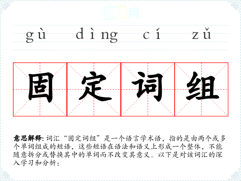 词汇“固定词组”是一个语言学术语,指的是由两个或多个单词组成的短语,这些短语在语法和语义上形成一个整体,不能随意拆分或替换其中的单词而不改变其意义。以下是对该词汇的深入学*和分析: