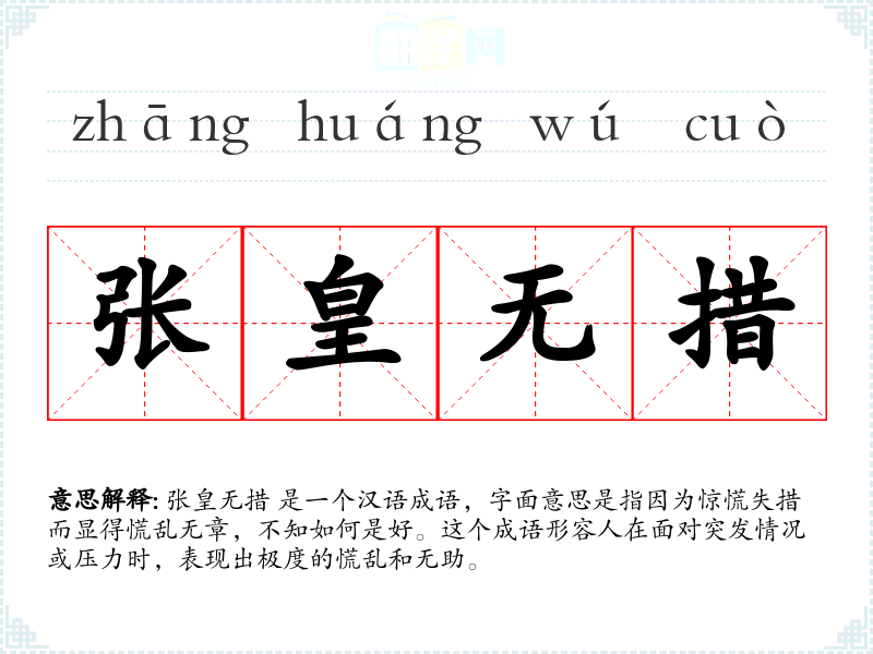 张皇无措 是一个汉语成语,字面意思是指因为惊慌失措而显得慌乱无章,不知如何是好。这个成语形容人在面对突发情况或压力时,表现出极度的慌乱和无助。