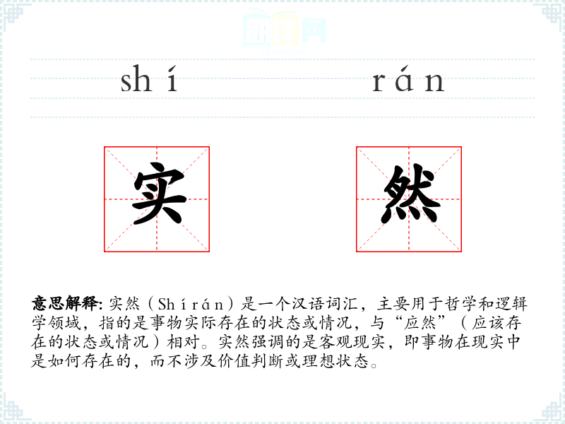 实然(Shírán)是一个汉语词汇,主要用于哲学和逻辑学领域,指的是事物实际存在的状态或情况,与“应然”(应该存在的状态或情况)相对。实然强调的是客观现实,即事物在现实中是如何存在的,而不涉及价值判断或理想状态。