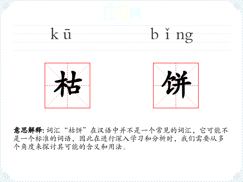 词汇“枯饼”在汉语中并不是一个常见的词汇,它可能不是一个标准的词语,因此在进行深入学习和分析时,我们需要从多个角度来探讨其可能的含义和用法。
