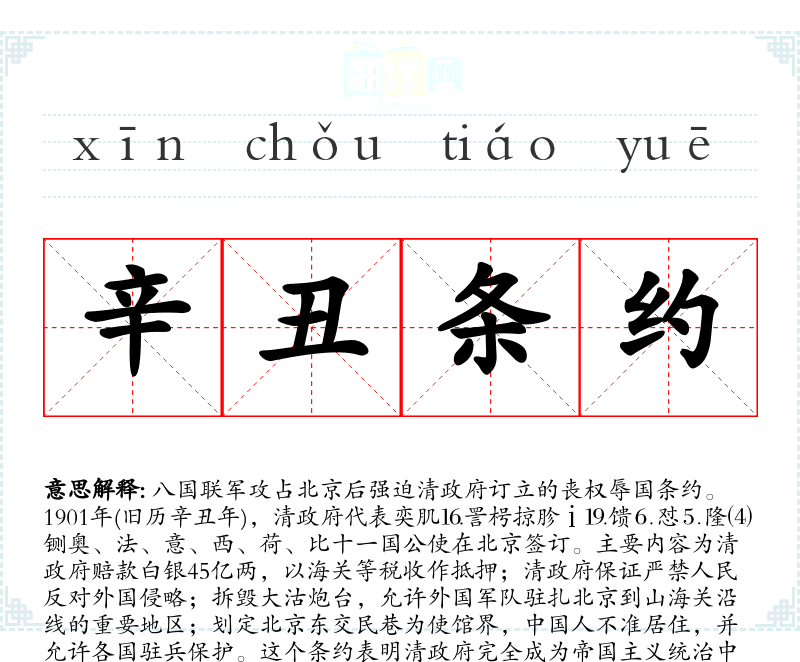 八国联军攻占北京后强迫清政府订立的丧权辱国条约。1901年(旧历辛丑年),清政府代表奕肌⒗詈枵掠胗ⅰ⒚馈⒍怼⒌隆⑷铡奥、法、意、西、荷、比十一国公使在北京签订。主要内容为清政府赔款白银45亿两,以海关等税收作抵押;清政府保证严禁人民反对外国侵略;拆毁大沽炮台,允许外国军队驻扎北京到山海关沿线的重要地区;划定北京东交民巷为使馆界,中国人不准居住,并允许各国驻兵保护。这个条约表明清政府完全成为帝国主义统治中国的工具,标志着中国已完全沦为半殖民地半封建社会。