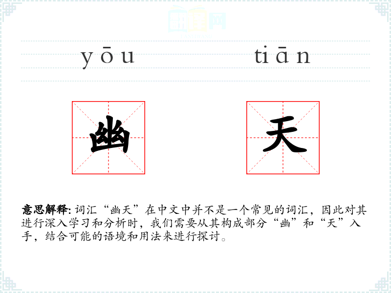 词汇“幽天”在中文中并不是一个常见的词汇,因此对其进行深入学*和分析时,我们需要从其构成部分“幽”和“天”入手,结合可能的语境和用法来进行探讨。