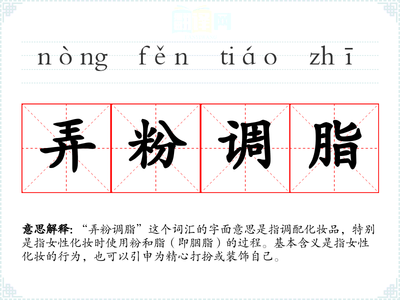 “弄粉调脂”这个词汇的字面意思是指调配化妆品,特别是指女性化妆时使用粉和脂(即胭脂)的过程。基本含义是指女性化妆的行为,也可以引申为精心打扮或装饰自己。
