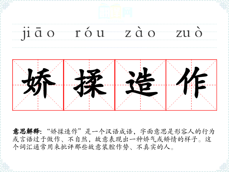 “娇揉造作”是一个汉语成语,字面意思是形容人的行为或言语过于做作、不自然,故意表现出一种娇气或矫情的样子。这个词汇通常用来批评那些故意装腔作势、不真实的人。