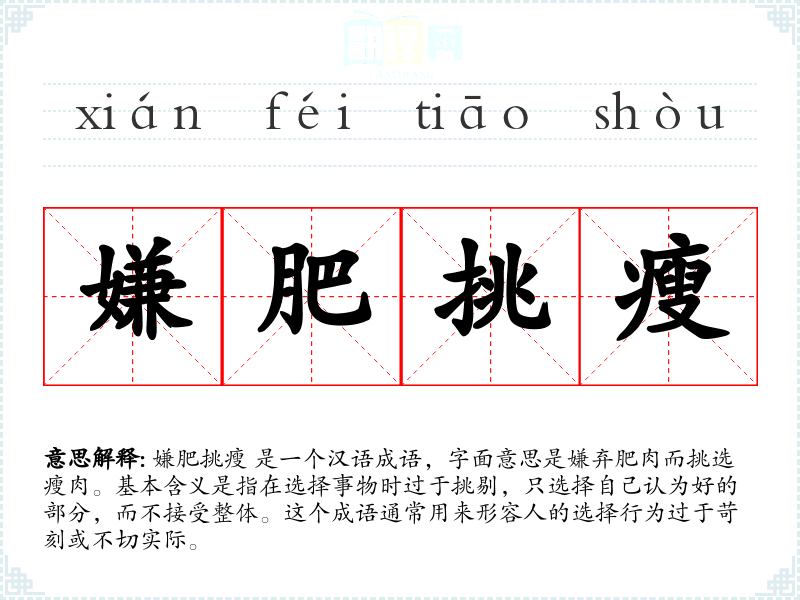 嫌肥挑瘦 是一个汉语成语,字面意思是嫌弃肥肉而挑选瘦肉。基本含义是指在选择事物时过于挑剔,只选择自己认为好的部分,而不接受整体。这个成语通常用来形容人的选择行为过于苛刻或不切实际。