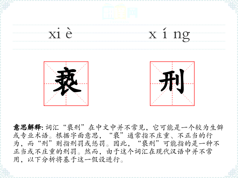 词汇“亵刑”在中文中并不常见,它可能是一个较为生僻或专业术语。根据字面意思,“亵”通常指不庄重、不正当的行为,而“刑”则指刑罚或惩罚。因此,“亵刑”可能指的是一种不正当或不庄重的刑罚。然而,由于这个词汇在现代汉语中并不常用,以下分析将基于这一假设进行。