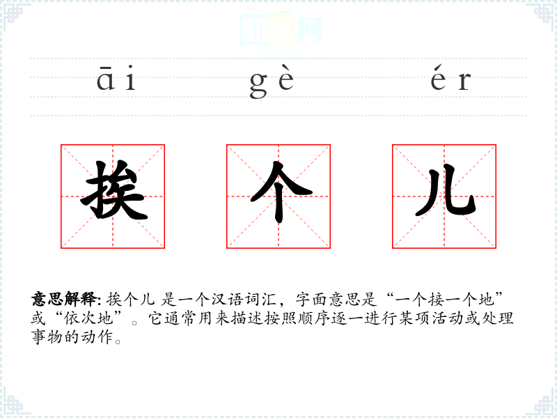 挨个儿 是一个汉语词汇,字面意思是“一个接一个地”或“依次地”。它通常用来描述按照顺序逐一进行某项活动或处理事物的动作。
