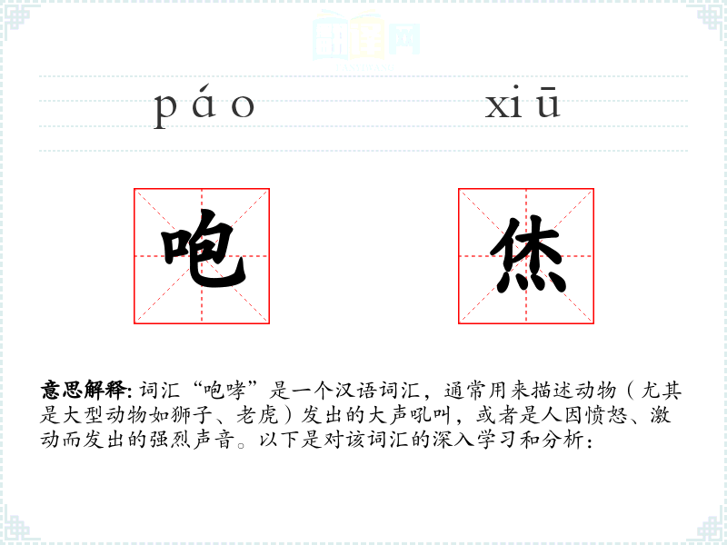 - 词源:“咆哮”一词源自古代汉语,其字形和发音在历史演变中保持相对稳定。