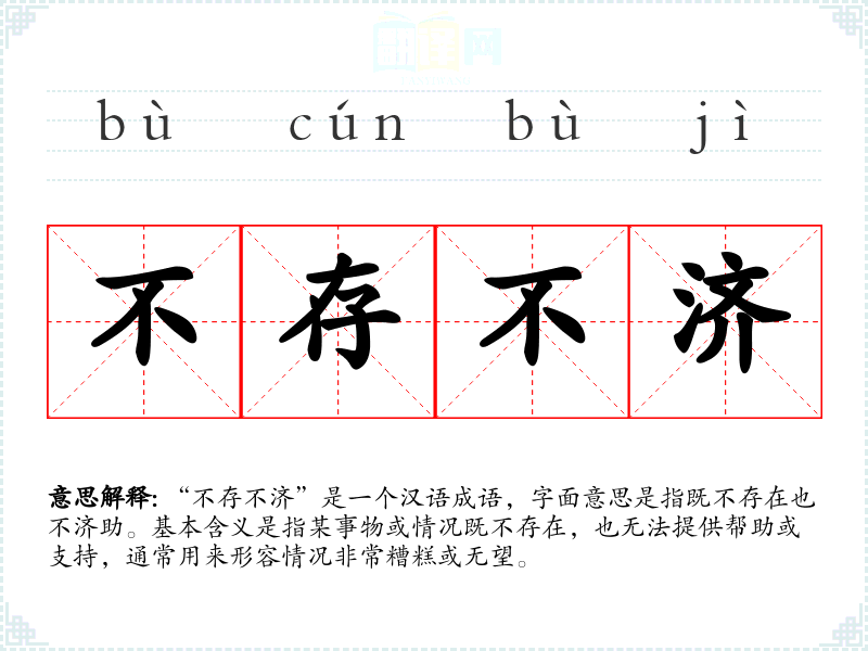 “不存不济”是一个汉语成语,字面意思是指既不存在也不济助。基本含义是指某事物或情况既不存在,也无法提供帮助或支持,通常用来形容情况非常糟糕或无望。