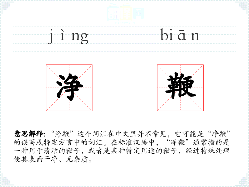 “浄鞭”这个词汇在中文中并不常见,其具体含义和用法需要根据具体语境来理解。如果是“净鞭”,则其基本含义是用于清洁的鞭子,可能在特定的文化或社会背景中具有特殊的意义。在学*语言时,了解词汇的具体用法和语境是非常重要的。
