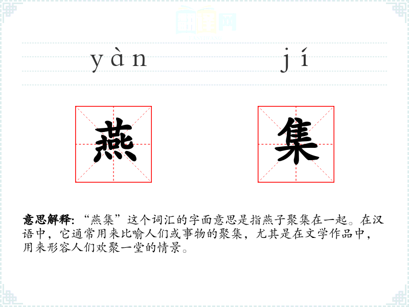 “燕集”这个词汇的字面意思是指燕子聚集在一起。在汉语中,它通常用来比喻人们或事物的聚集,尤其是在文学作品中,用来形容人们欢聚一堂的情景。