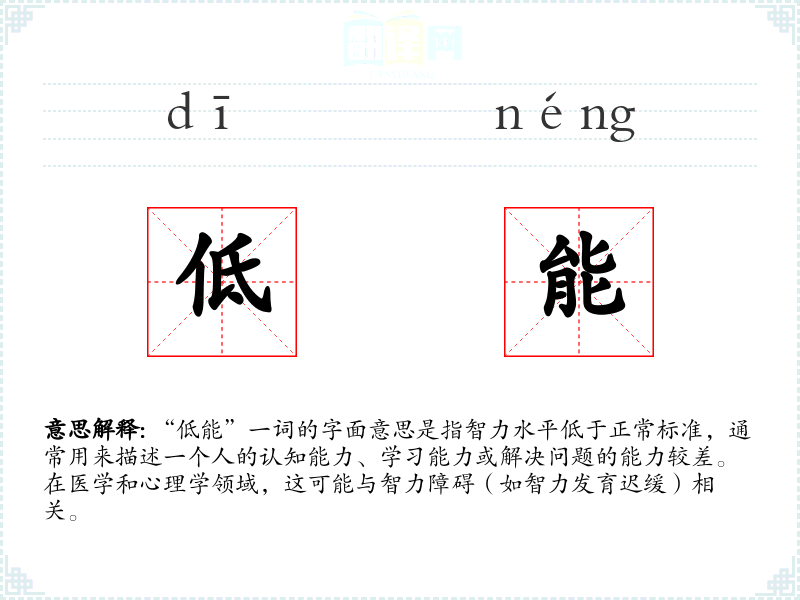 “低能”一词的字面意思是指智力水平低于正常标准,通常用来描述一个人的认知能力、学习能力或解决问题的能力较差。在医学和心理学领域,这可能与智力障碍(如智力发育迟缓)相关。
