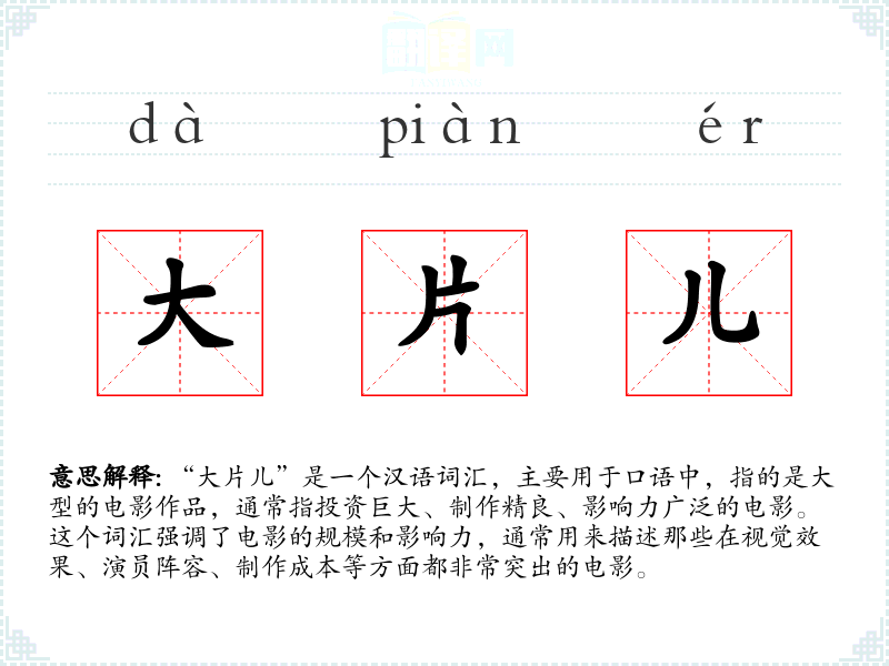 “大片儿”是一个汉语词汇,主要用于口语中,指的是大型的电影作品,通常指投资巨大、制作精良、影响力广泛的电影。这个词汇强调了电影的规模和影响力,通常用来描述那些在视觉效果、演员阵容、制作成本等方面都非常突出的电影。